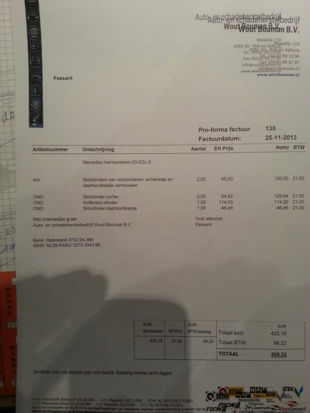 Bij het proberen heeft de monteur de sleutel afgebroken in het contact. Nu moet ik een compleet contact slot kopen(dat had ik vast al moeten doen) maar ook alle cilinders vervangen van alle deuren (omdat de oude sleutel door hem is afgebroken en nog in de oude contactslot zit). Ik heb nog duidelijk verteld dat ik geen reserve sleutel heb.