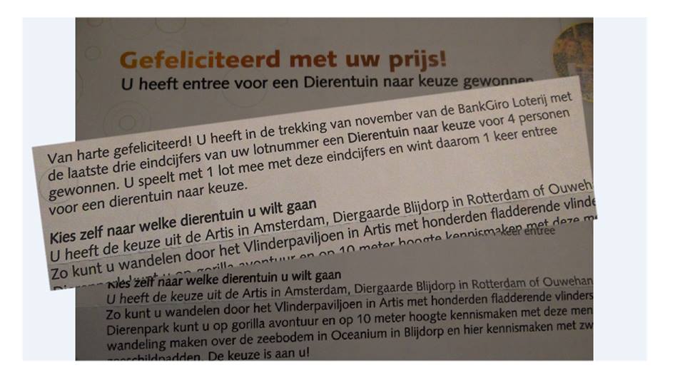 Leuk hoor, we hebben vier entreekaarten gewonnen voor een dierentuin naar een ruime keuze (volgens de Bankgiroloterij) van drie (!) dierentuinen, maar oh… Wat staat er achter? We hebben er maar ééntje gewonnen. Omdat we met één lot meespelen!? Wie begrijpt dit nog? Er staat toch echt: “U heeft in de trekking van november met de laatste drie eindcijfers een “Dierentuin naar keuze voor 4 personen gewonnen”. Als je dan per lot moeten winnen had er volgens ons toch écht moeten staan: “Dierentuin naar keuze voor 1 persoon gewonnen”