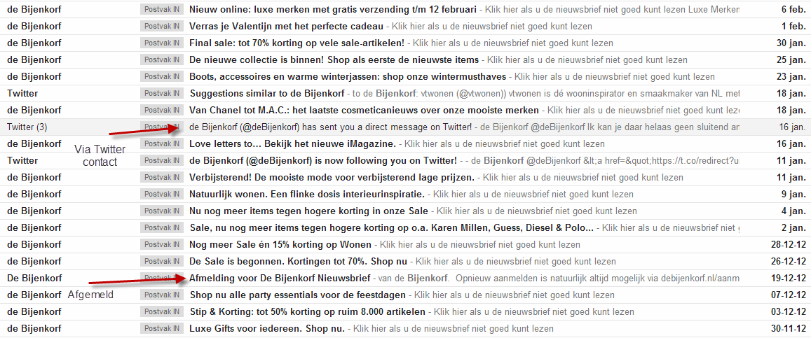 19 december afgemeld voor de nieuwsbrief van de Bijenkorf. De nieuwsbrief bleef komen. Ik heb gevraagd hoe dat kan. Het antwoord is dat het 14 dagen duurt voordat de afmelding is verwerkt. Op zich is dat al erg vreemd, want aanmelden gaat wel direct. Waarom dan niet afmelden? Enfin, ik heb 14 dagen gewacht (en ondertussen bleef ik mail ontvangen). Uiteindelijk 16 januari maar via Twitter een bericht de wereld ingestuurd dat de Bijenkorf het niet zo nauw neemt met afmeldingen. Daar werd direct op gereageerd (zoals ik had verwacht) en er werd beloofd om mij uit het bestand te halen.