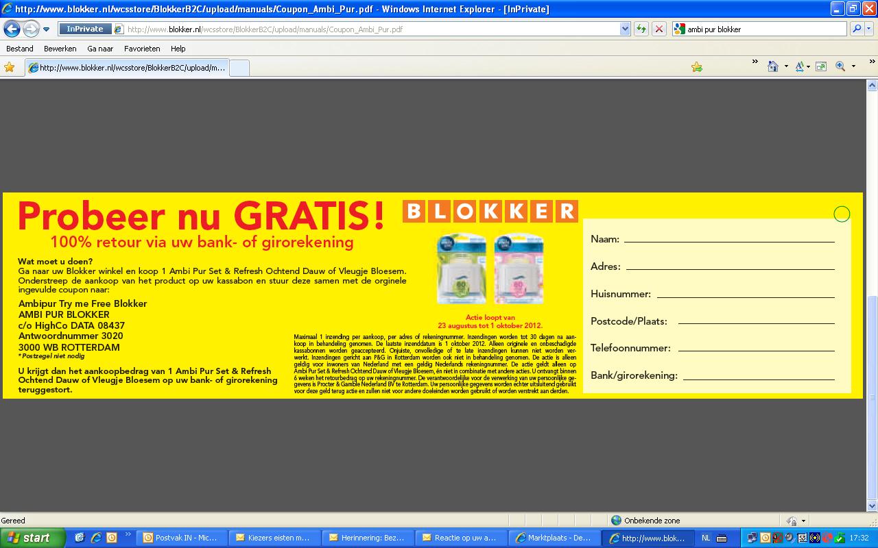Omdat deze aktie vermeld werd op de website van BLOKKER ging ik er van uit dat deze coupon de originele coupon was, dat ik die gewoon thuis zou kunnen printen, invullen en opsturen.