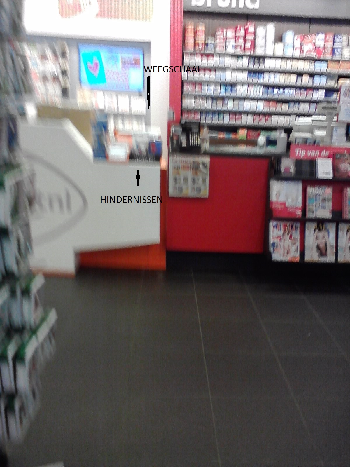 De weegschaal t.b.v. poststukken is maximaal verwijdert van de aanbiedende klant en het wordt nog erger gemaakt door de versperring aan materiaal voor de weegschaal.