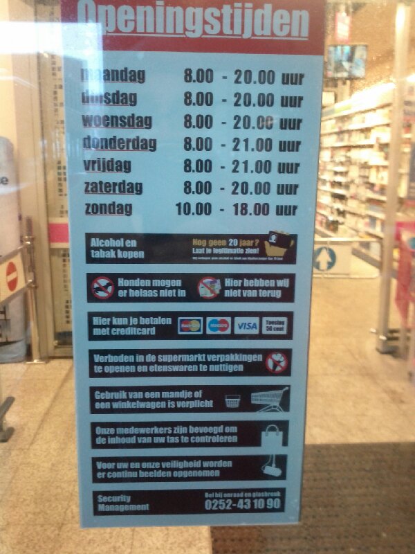 Digros dient een bord op te hangen, duidelijk zichtbaar , dus niet op een opengaande schuifdeur ,waarin dit wordt aangegeven. Dit zijn jullie wettelijk verplicht !!!