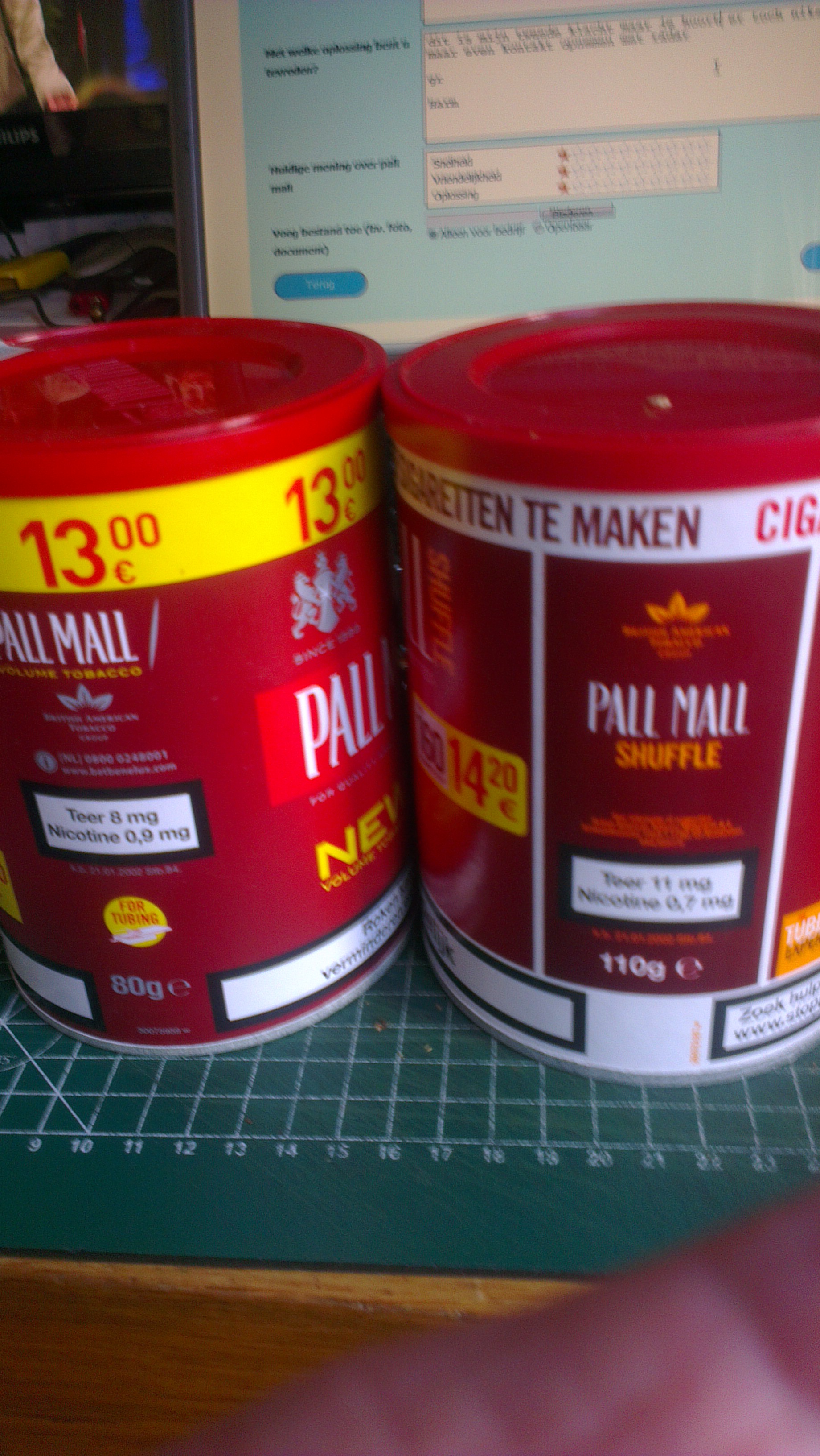 Heb nu het grote blik rood wat zie ik hee goedkoper nu 13 € in plaats van 14,20 € een teleurstelling zat 110 gram en nu 80 gram erg, en wat raar is, je kan volgens het blik 160 sigaretten maken, of je nou 110 gram hebt of 80 gram haha.