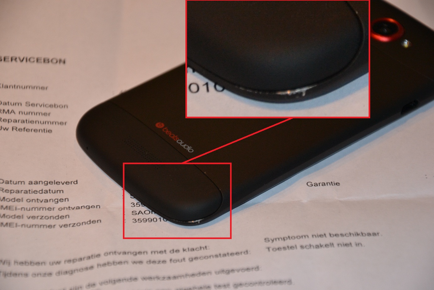 Ook staat er op de bon dat de telefoon niet zou inschakelen, hij is echter NOOIT met die klacht aangemeld, maar met het beruchte coating gate probleem.