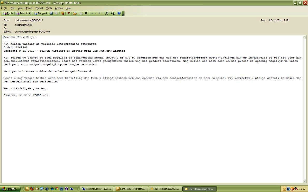 In september 2010 een wireless router van Belkin gekocht bij Ibood. Na net een jaar geeft het apparaat de geest dus retour gestuurd onder garantie. Op 6-12-2011 ontvang ik netjes een ontvangstbevestiging dat de router is ontvangen (zie bijlage) En dan blijft het stil.. Omdat ik inmiddels een anderen router aangeschaft bij Ibood is het minder urgent. In september 2012 informeer ik waar de Belkin router blijft. Er wordt bevestigd dat dit onacceptabel lang duurt en men beloofd op zoek te gaan nadat ik het ontvangstmailtje doorstuur. Ik stuur de ontvangstbevestiging als bijlage in Outlook retour. Vervolgens blijft het weer bijna 2 weken stil. Als ik opnieuw bel met Thomas van Ibood wordt mij verzocht om een printscreen van de ontvangstbevestiging omdat de bijlage niet leesbaar zou zijn. Nadat ik ook die heb toegestuurd krijg ik als antwoord dat ik ook nog een track en tracecode en een ontvangstbewijs met legitimatie moet aanleveren anders kan men verder niks betekenen. Ik pas voor dit spelletje en bel uiteraard boos op. Thomas weigert het te escaleren en is niet mij met een leidinggevende door te verbinden. Ibood maakt eerst mijn router zoek en weigert mij te compenseren omdat zij ook het bevestigingsmailtje in hun systeem zijn kwijt geraakt.