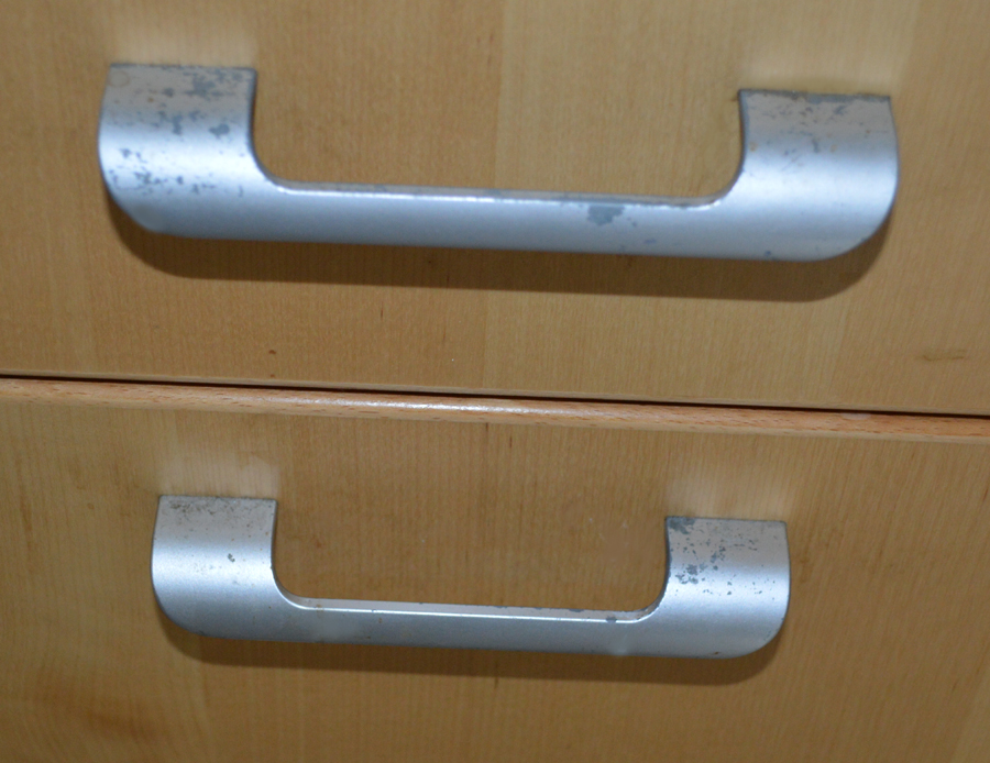 5 jaar geleden hebben wij een Ikea keuken gekocht die goed bevalt. Echter de erbij gekochte Ikea handgrepen waren slecht van kwaliteit. Al vrij snel na aankoop begon de aluminium verflaag (!) af te bladderen met als resultaat dat ze er na vijf jaar uitzien als op bijgevoegde foto.