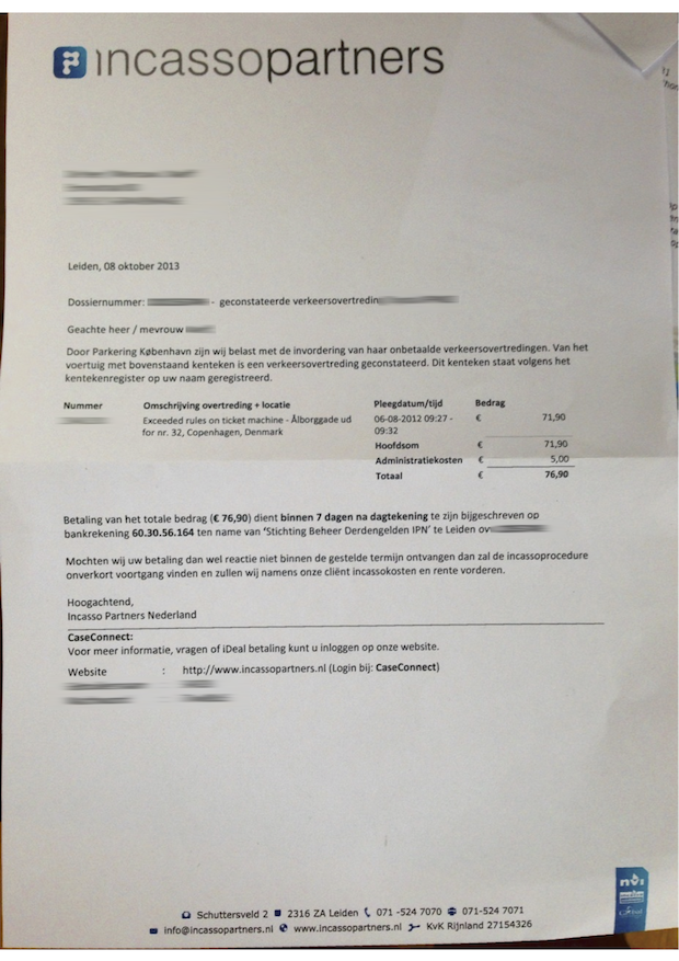 Ik ben 1 weekje op vakantie kom ik tot mijn grote verbazing een brief tegen van IncassoPartners of ik binnen 7 dagen € 76,90 wil overmaken. Het blijkt te gaan om 1 jaar oude bekeuring waarvan ik het bestaan niet afwist uit Denemarken.