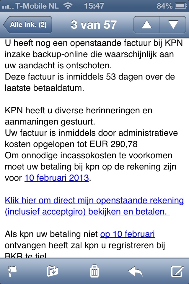 Dezelfde als alle andere. Een email gekregen van intrum Justitia dat ik een openstaande rekening heb van KPN back up online van 209 euro. Dat ze meerdere keren aanmaningen hebben gestuurd. Niets is waar! Ik heb geen KPN en nooit iets ontvangen. Heb direct het nummer gebeld die in de mail stond en kreeg een bandje te horen van een ander bedrijf en dat ze hun nummer in een spam bericht hadden gebruikt. Bijlage screenshot email