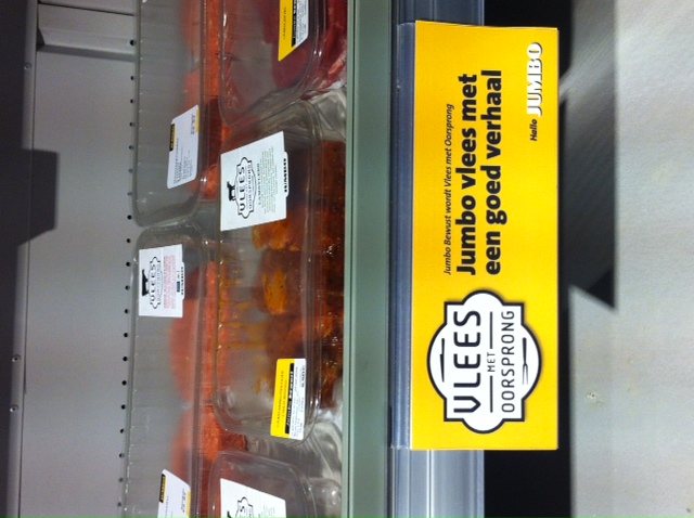 Bij de Jumbo (in Zwolle) word je naar het het vleesvak geleid dmv een bord waarop staat: “Jumbo vlees met een goed verhaal”