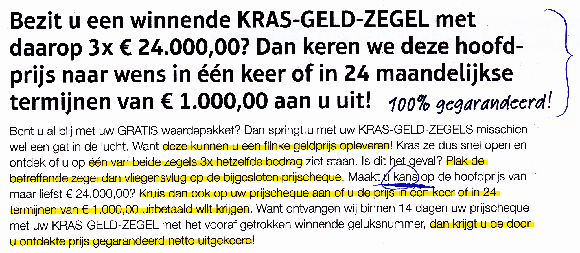 Klingel zegt zwart op wit, met grote zwarte letters, een gegarandeerd bedrag aan gewonnen prijzengeld uit te betalen bij 3x hetzelfde gekraste bedrag. iedereen heeft dat natuurlijk. In dit geval 24.000,00 euro. Slechts het zegel opsturen en dan…kassa. Daarna, in een volgende alinea zegt men: indien u kans maakt op……..