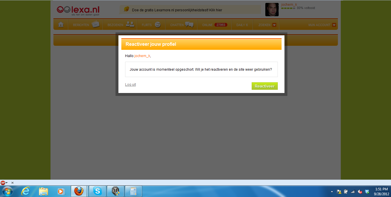 U kunt dus nog tot 28-10-2012 gebruik maken van de betaalde diensten op de website door opnieuw in te loggen op uw profiel. Indien u uw profiel in zijn geheel definitief van de website wilt verwijderen, dient u ook opnieuw in te loggen op uw profiel. Indien u uw profiel wilt verwijderen gaat u naar de pagina "Mijn account" en dan "Mijn instellingen". Onderaan deze pagina vindt u de link om uw profiel te verwijderen. Klik op de link in de volgende zin: "Om jouw profiel op te schorten of te verwijderen, klik hier".
