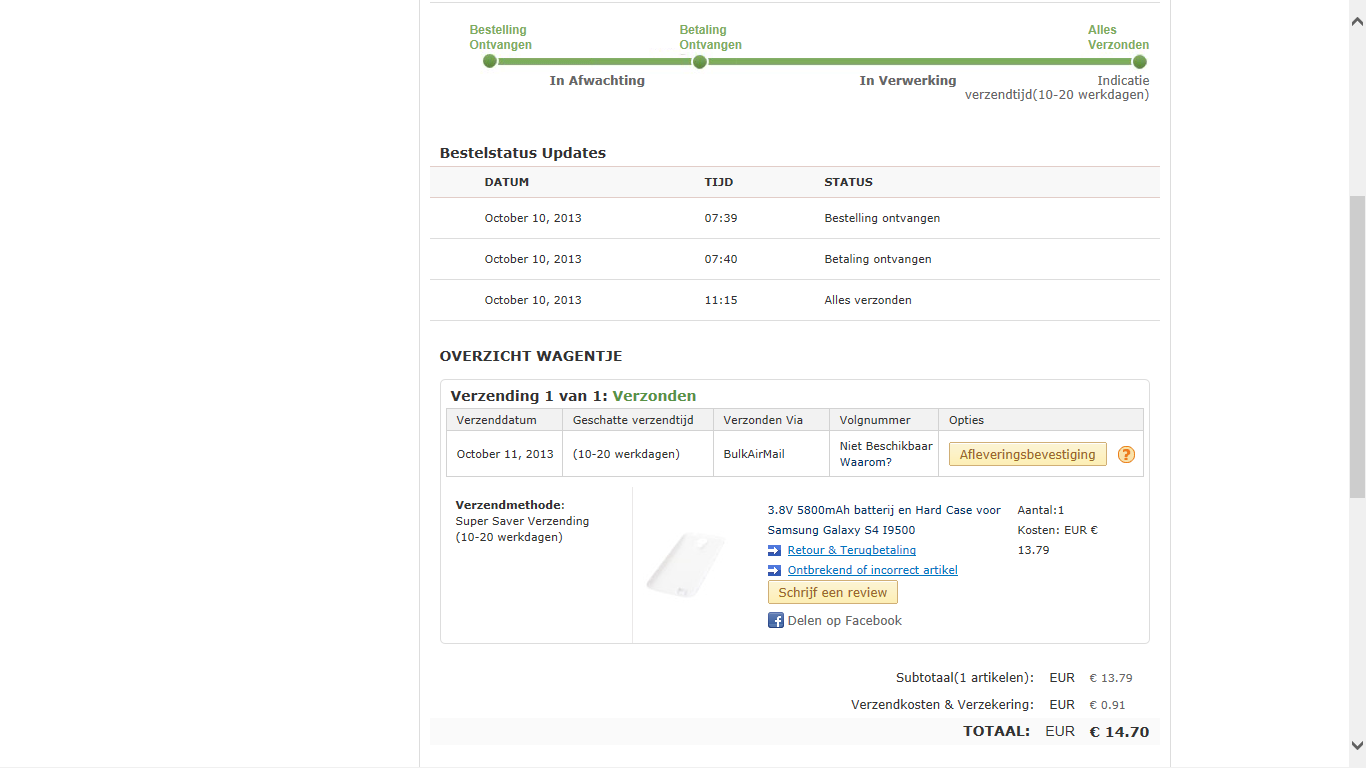Ik heb op 10-10-2013 een bestelling geplaatst en alles is op de zelfde dag verzonden via BulkAirMail staat er op de website. En de verzendtijd is 10-20 werkdagen. En we zijn vandaag precies een maand verder en dat is 23 werkdagen. En het pakket volgen is niet mogelijk er dat het niet beschikbaar. En wanneer je ze een mail stuurt krijg je een automatische bericht wat nergens op slaat en rommelig en erg onduidelijk is.
