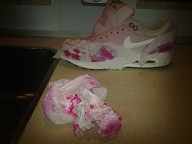 Tijdens het schoonmaken werd het water al helemaal roze. De schoen in nu wel schoon maar het roze is helemaal uitgelopen.