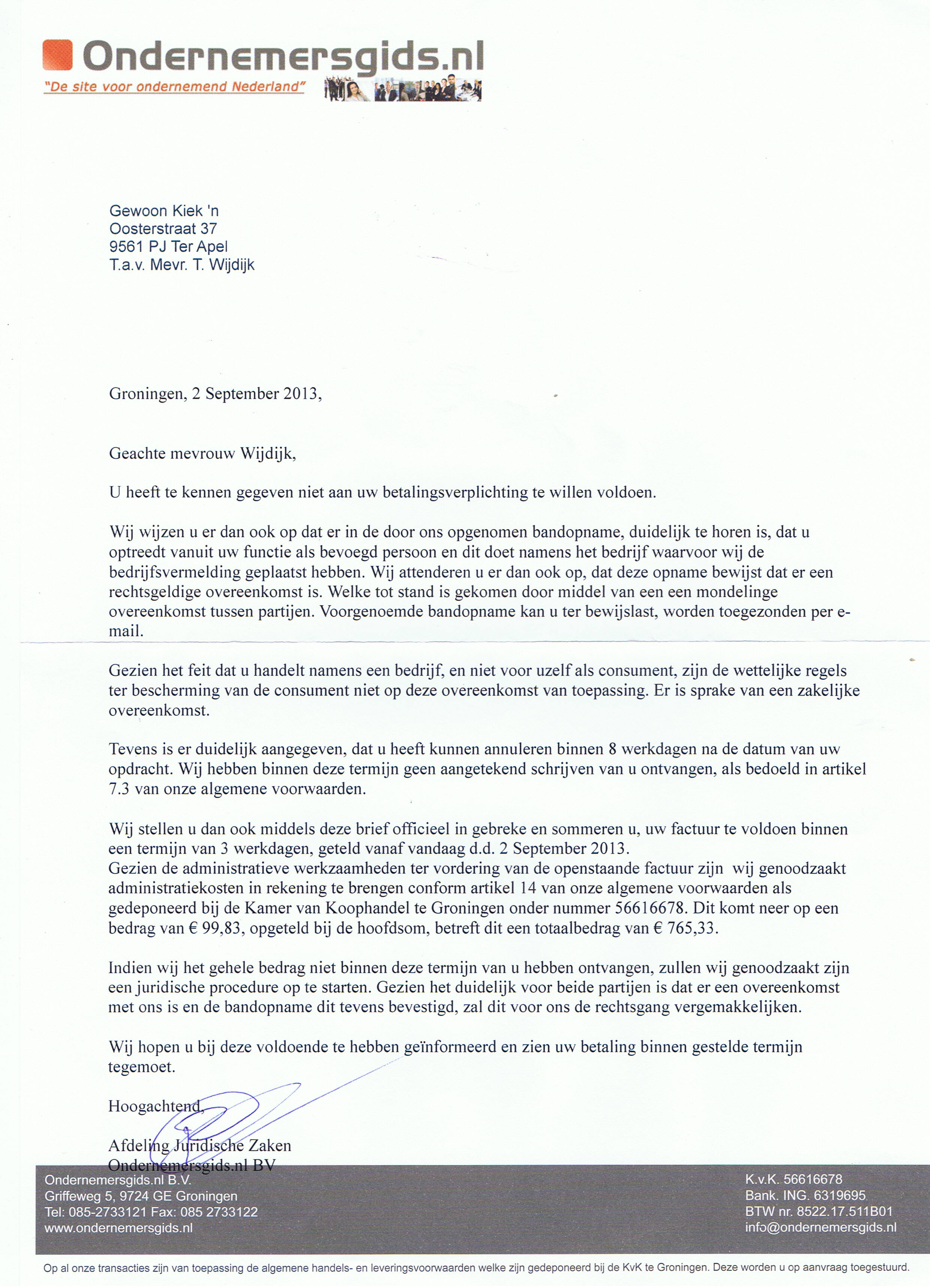 Hier werd o.a. gevraagd of het klopt dat ik de gratis vermelding wilde beeindigen dit heb ik bevestigd. Wel heb ik een paar keer gevraagd dat het vreemd is dat ik een gratis vermelding moet beeindigen.Tot mijn grote verbazing ontving ik een factuur van € 665,00 voor een vermelding van 1 jaar. Hierop heb ik een aangetekende brief gestuurd dat ik eis om de opname en dat ik zeker geen contract met hun ben aangegaan en dat ik ook zeker niet het factuurbedrag zal betalen. Heb geen bandopname ontvangen. Op 2 september ben ik weer telefonisch benaderd door een onvriendelijke man dat ik mijn factuur nog niet had betaald heb hem medegedeeld dat ik dit ook niet van plan ben. Vandaag 3 september ontvang ik een brief dat ik nog niet aan mijn betalingsverplichting heb voldaan en dat de kosten zijn verhoogd met € 99,83 indien ik niet betaal zullen ze een juridische procedure opstarten.