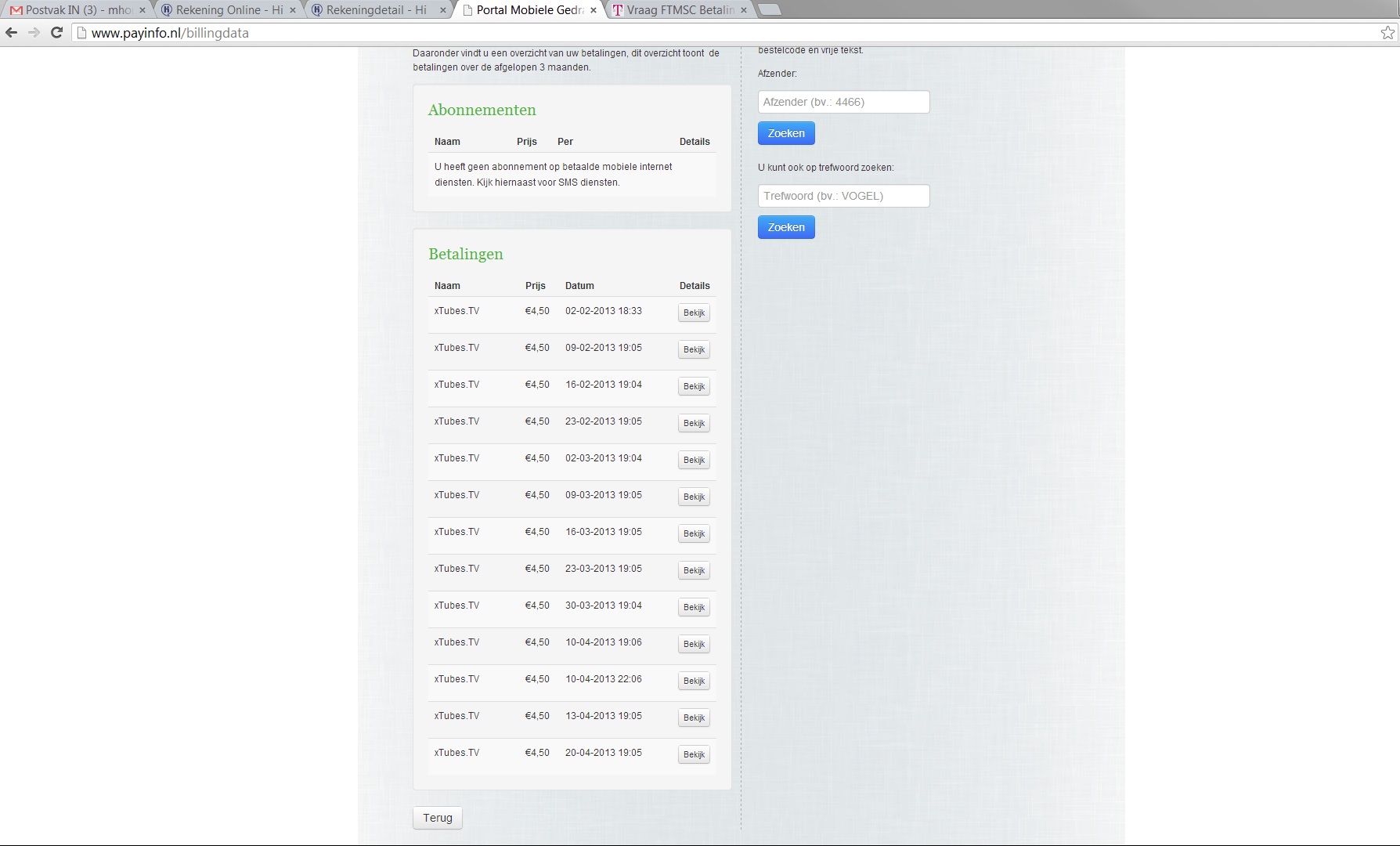 In totaal is er over drie facturen verspreid van de afgelopen maanden een bedrag van E 40,92 excl. BTW onterecht gefactureerd. De site ´Payinfo.nl´ heeft het zelfs over 13 maal E 4,50, Oftewel E 58,50. Zie bijlage.
