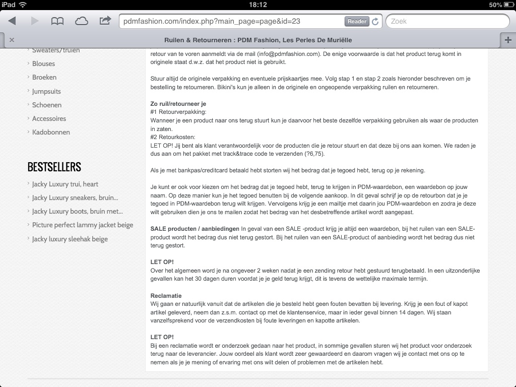 Naast het feit dat de verkeerde kleur broek was geleverd, zag ik op de website van PDM Fashion dat de taupe kleur was uitverkocht en dat deze ook goedkoper is dan de zwarte broek! Kortom deze webwinkel belooft een goede prijs/kwaliteitsverhouding, maar in feite word je gewoon belazerd.