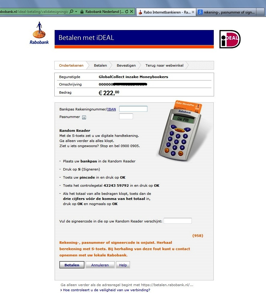 Rabobank has still big peoblems if you want to pay something vie iDEAL.Evry time it says “fout 958” , but after few tries the payment can be done. Sometimes after third trial (if you are lucky) and sometimes you need to try 10-15 times and still nothing happens. Two years nobody can solve it, and when you call 0900 number, untrained personell is telling you the sories how your Pc is not good, or your pin pas is not good…I am tired of those stupid coments and thinking to close all my accounts and to change the bank just because I do not want to me malested every time by some bank or its employees.