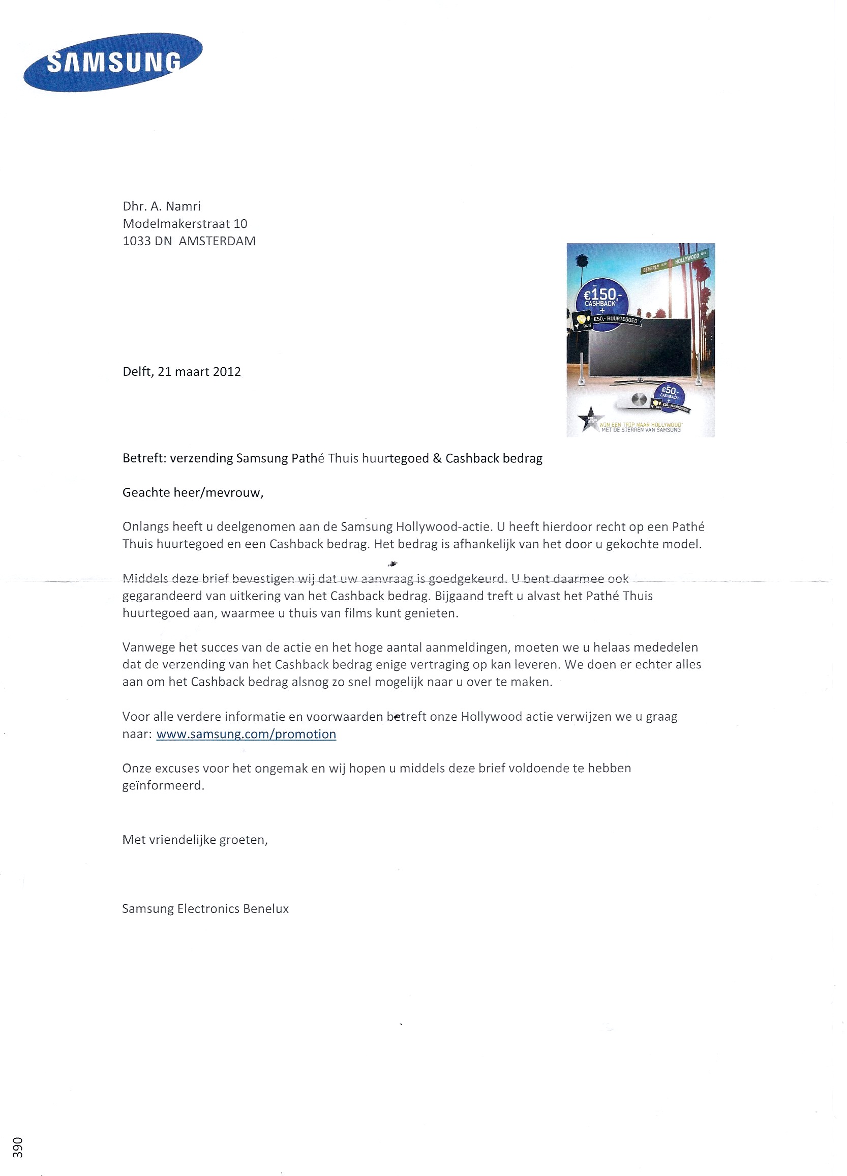 In maart 2012 heb ik een samsung TV gekocht van boven de € 2.000,-. In een brief van samsung in die zelfde maand nog heb ik een goedkeuring gehad en er stond letterlijk in dat gegarandeerd ben van een uitkering van €150,- cash back (zie de brief van samsung in de bijlage). Op 24 juli 2012 heb ik van samsung een mail gehad waarin stond dat het geld al was overgemaakt.
