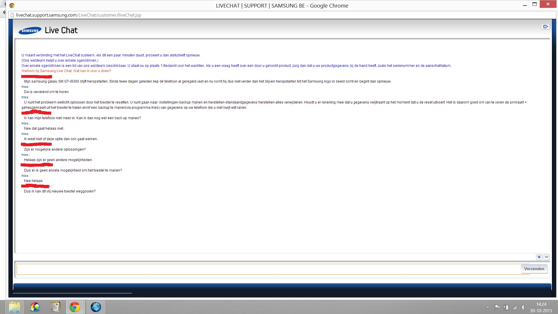 Mijn Samsung Galaxy 3III bleef maar heropstarten. Volgende de online support was er geen oplossing. Uiteindelijk is het mij zelf toch gelukt om de fabrieksinstellingen terug te zetten (met besparing van opsturen voor reparatie). Toch erg vervelend dat ze bij online support niet instaat zijn je te helpen met het terug zetten van de fabrieksinstellingen. Naderhand denk ik dat met terugzetten van oude software het probleem ook was opgelost en ik al mijn instellingen en downloads nog had gehad. Dit kon volgens de support ook niet, maar ja, wat weten die nou..