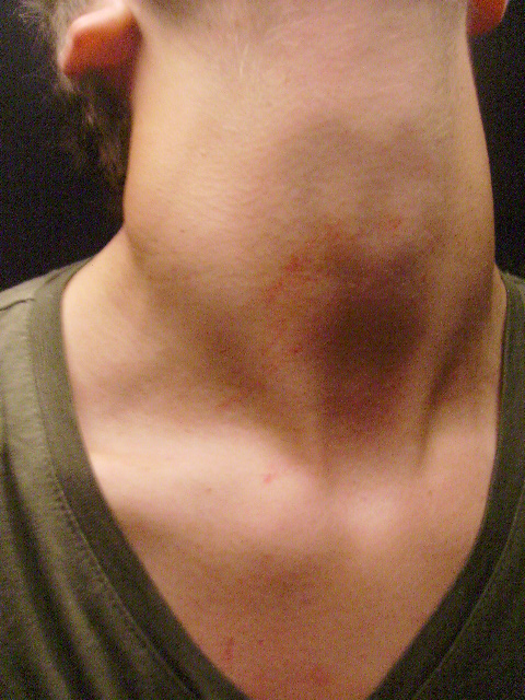 hierbij de foto van mijn zoon zijn keel, door beveiliging gedaan man met bril baard, kaal hoofd