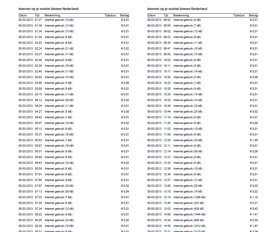 In de bijlage een printscreen van de specificatie. Hierop is te zien dat het dataverbruik de hele nacht doorging (zie screenshot, dat is maar 1 van de 6 pagina’s). En dat dagelijks. Naar mijn idee dienen ze wel iemand te waarschuwen. Zo komen mensen alleen maar in problemen. Simyo wil hier uiteraard alleen aan verdienen.
