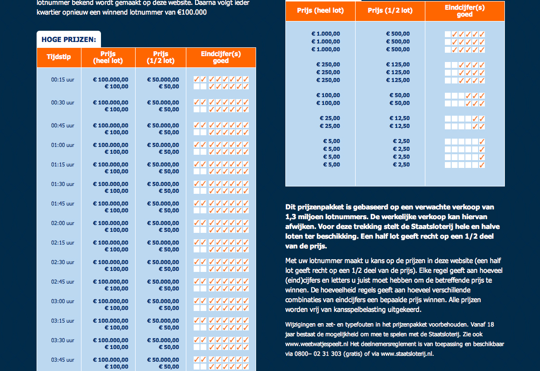 Volgens het prijzenpakket zou je bij 1 cijfer goed 5 euro winnen, bij 2 cijfers goed 25 euro en bij 3 cijfers goed 100 euro etc.