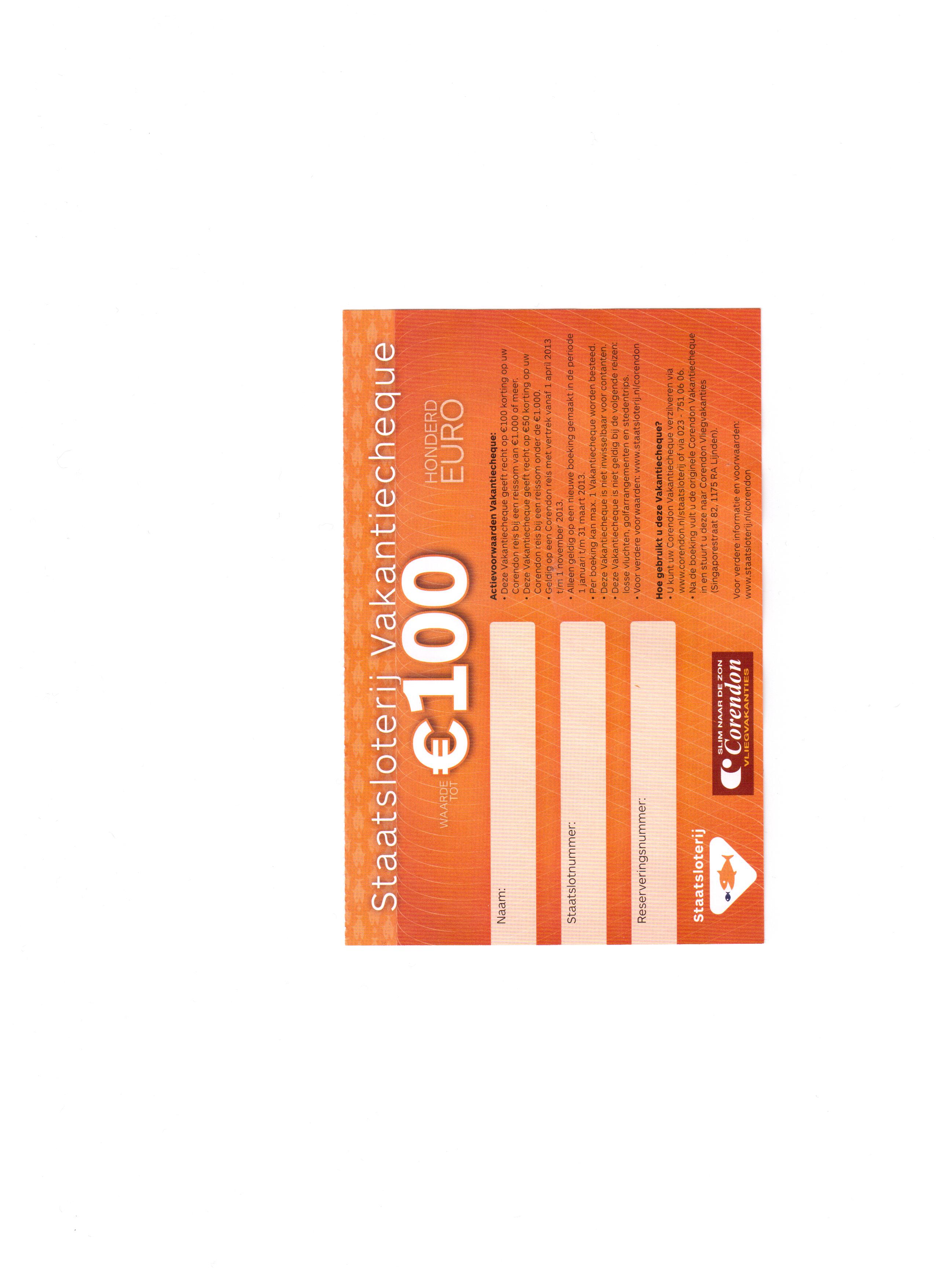 Via de post van de staatsloterij een vakantiecheque aangeboden gekregen dat als ik een reis met Corendon boek ik 100 euro korting zou krijgen op een reis.