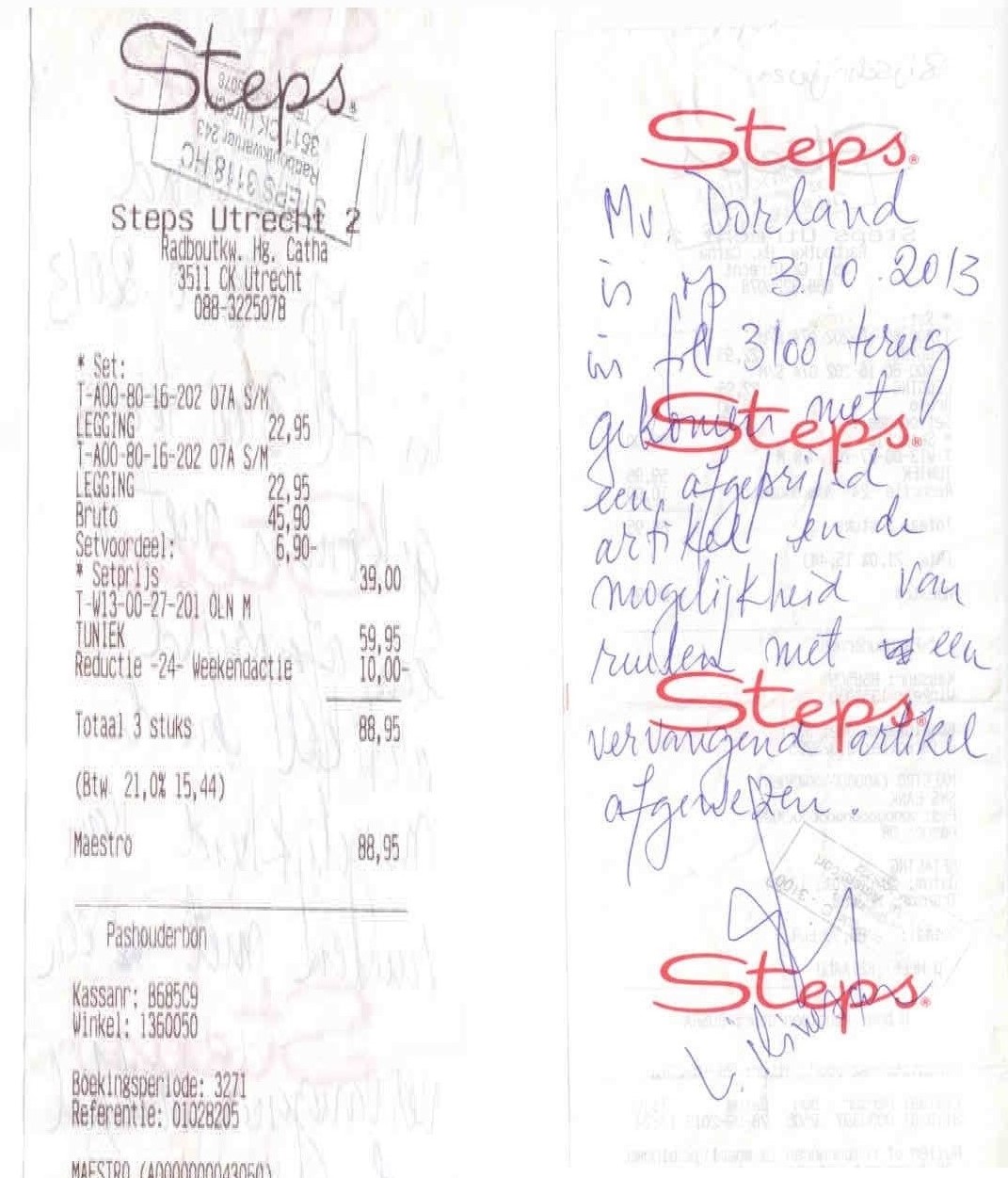 28 oktober was mijn vrouw bij de Steps op Hoog Catharijne in Utrecht en kocht daar een Tuniekje. Wij wonen in Amersfoort, dus niet direct op loopafstand van deze winkel. Eenmaal thuisgekomen had ze toch wat twijfel over haar aankoop.