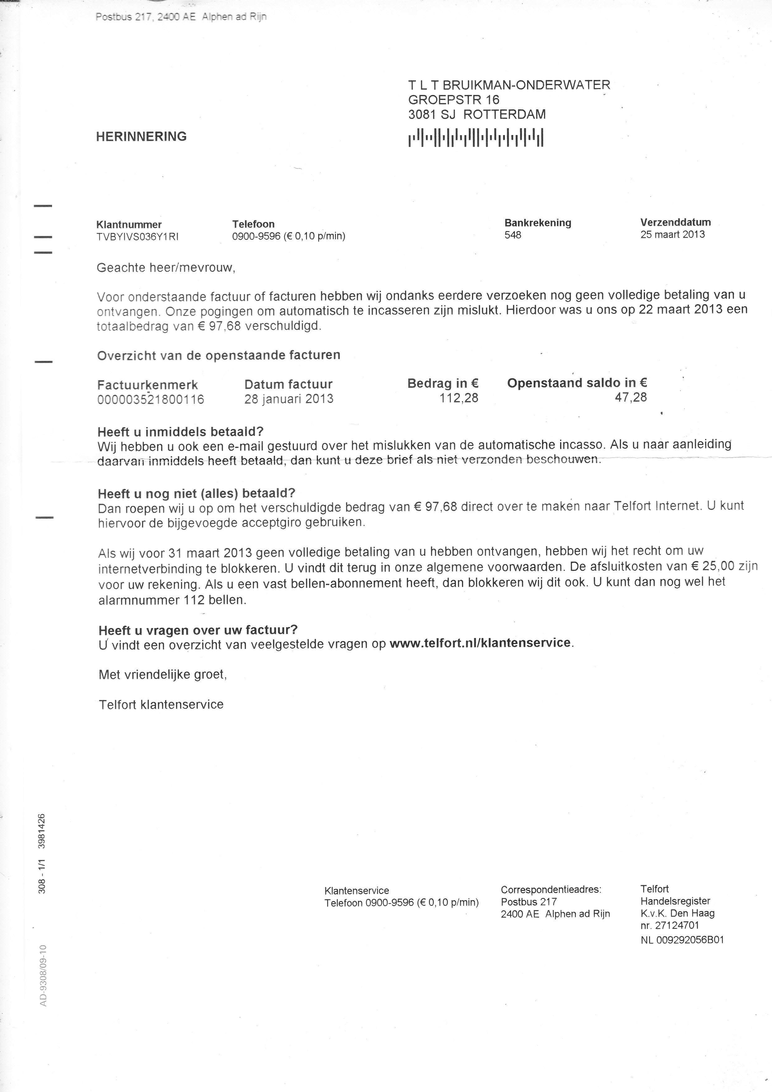2. Omdat het aut. wordt afgeschreven zie ik ineens dat er 112,28 is afgeschreven. Denk dat er een fout is gemaakt en trek er zelf één maand af.Omdat mijn gezondheid van dien aard is dat ik weken niet in staat ben om uit bed te komen ivm koorts en zodanige medicatie dat ik van voren niet weet wat achter mij gebeurt en veel weg ben omdat ik dan niet alleen kan zijn krijg ik ineens een dreigbrief dat ik per direct moet betalen anders wordt ik afgesloten. Ik heb klantenservice vele malen gebeld (10 cent p/min). Hele vriendelijke mensen. Heb proberen uit te leggen dat ik door de vele vaste lasten pas dit bedrag de 20ste kan betalen (toeslagen) maar alsnog willen ze mij afsluiten wat ook enkele uren is gebeurt.Als je bent afgesloten dan kan je niet per Internet betalen en als je reuma en straatvrees heb, dus niet buiten kom had ik groot probleem, wilde wel betalen al vond ik het weer valse voorstelling van zaken maar hoe. Telfort heeft me alsnog weer aangesloten en ik heb betaald. Maar bij de volgende rekening wordt wel weer 25 euro adm kosten extra berekent. Ook heb ik een brief gehad op 25 maart waarin de bedragen niet kloppen. Steeds maar bellen en bellen om welk bedrag hert gaat want ik kan tot heden niet in mijn facturen kijken omdat ik geen password heb van mijn Telfort. Steeds wordt er een nieuw gebruikersnaam aangemaakt maar werkt nooit.Telfort kan ook zien dat ik dus nog nooit ingelogd ben geweest.In de brief wordt gesproken over 47,28 achterstaand maar ik moet dan per direct 97,68 betalen wordt daarin vermeld. Nu dat blijkt dus een foutje te zijn geweest?……………