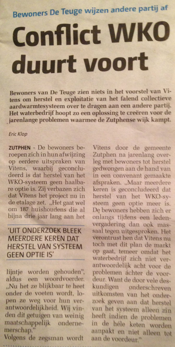 Tja, wat dan. In de zomer van 2011 besluit Vitens tot beëindiging van het centrale WKO systeem. Na een jaar praten doet Vitens eenzijdig een voorstel (samen met de gemeente Zutphen) om over te gaan op HR ketels / gas en dat onder voorwaarde dat de bewoners niet proberen de schade (die ze dus schijnbaar lopen) te verhalen op wie dan ook. Dat heet finale kwijting.
