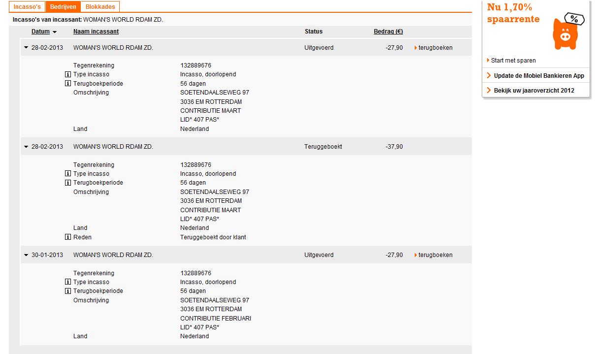 Ik ben ingeschreven bij een sportschool, woman´s world, en de maand februari heb ik netjes op tijd betaald (op 30-01-2013) wat ook te zien is op mijn afschriften. Nu zegt de sportschool dat ik de maand februari niet heb betaald. Want zij zien bij hun rabobank afschriften (zeggen ze) dat het bedrag gestorneerd is en dat ze later dat bedrag opnieuw hebben proberen af te schrijven maar dat lukte niet. Dit hele verhaal kan ik absoluut niet terugzien in mijn afschriften en ik zie gewoon dat ik netjes heb betaald en dat de betaling is geaccepteerd. Ik heb gisteren zelfs de ing gebeld en die zeiden ook dat ik gewoon betaald heb. Nu zegt de sportschool dat ik dat bedrag moet betalen incl 10,- boete terwijl ik al betaald heb. Ze hebben daarna dus dat bedrag incl 10,- boete van mijn rekening afgeschreven, maar dit heb ik natuurlijk per direct teruggeboekt omdat ik al heb betaald. De afschriften heb ik ook al via de mail gestuurd, maar zij zeggen dat het een welles-nietes spel is en eigenlijk komt het erop neer dat zij hun systeem vertrouwen en mij beschuldigen. Ik kan nu ook niet sporten terwijl ik betaald heb dus ze benadelen mij nog meer. Het liefst wil ik het contract per direct ontbinden, vooral omdat ze gisteren aan de telefoon recht in mijn gezicht heeft opgehangen. En ik word de hele tijd beschuldigd en behandelt als een crimineel, terwijl ik gewoon betaald heb.